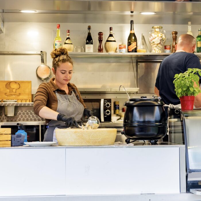 Mais ce qui fait de Baffetti un Food Truck unique, c’est sa spécialité de pâtes directement cuisinées dans la meule de parmesan… bien plus que de la gourmandise… un véritable spectacle !