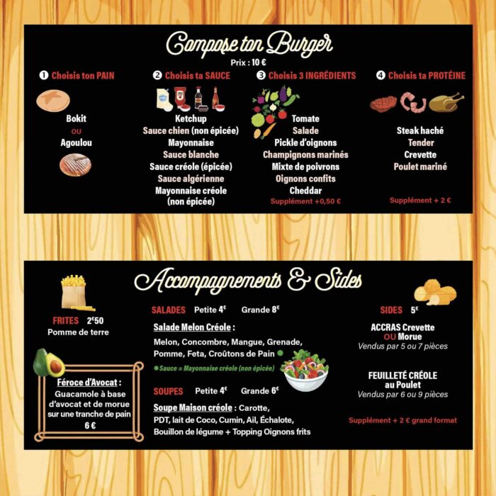 Au menu au Food Truck Thousand Trucky, des burgers aux saveurs créoles à personnaliser selon tes goûts et tes envies ! Pain bokit ou pain agoulousteak haché, crevette ou poulet mariné… le tout sublimé par la sauce de ton choix, aujourd’hui c’est toi le chef !