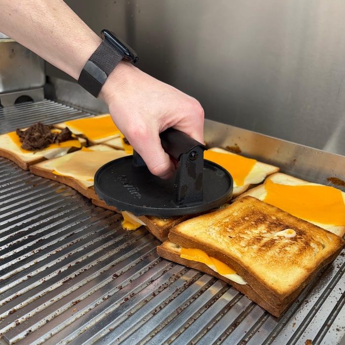 Lors de nos premiers tests, on a tellement mis de fromage qu’en ouvrant le grilled cheese… on a fait un fil de presque 2 mètres !